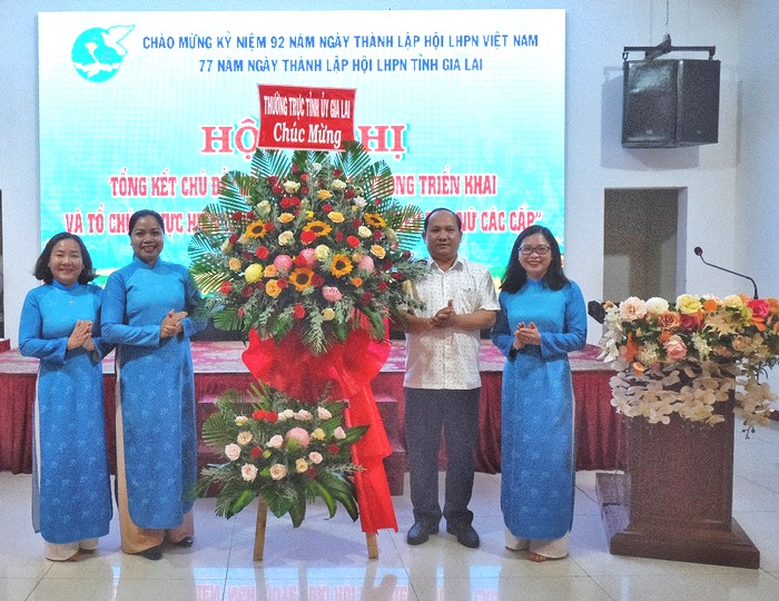 Dịp này, Phó Bí thư Tỉnh ủy Rah Lan Chung thay mặt lãnh đạo tỉnh tặng hoa cho Hội LHPN tỉnh, đồng thời gửi lời chúc mừng đến toàn thể cán bộ, hội viên phụ nữ trong tỉnh nhân kỷ niệm 92 năm Ngày thành lập Hội LHPN Việt Nam (20/10/1930-20/10/2022) và 77 năm Ngày thành lập Hội LHPN tỉnh Gia Lai (27/10/1945-27/10/2022).