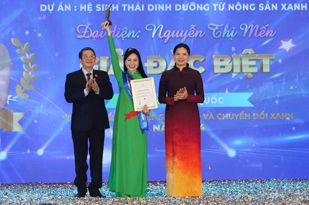 Nhờ những tác động lớn và mở ra hướng đi mới cho lĩnh vực nông sản của Việt Nam với mức độ gia tăng gấp từ bốn đến sáu lần thông qua chế biến và phân phối tiêu dùng, Dự án "Hệ sinh thái dinh dưỡng từ nông sản xanh" của chị Nguyễn Thị Mến được hội đồng chuyên gia đánh giá cao và được trao giải đặc biệt của Cuộc thi "Phụ nữ khởi nghiệp sáng tạo và chuyển đổi xanh" năm 2024.