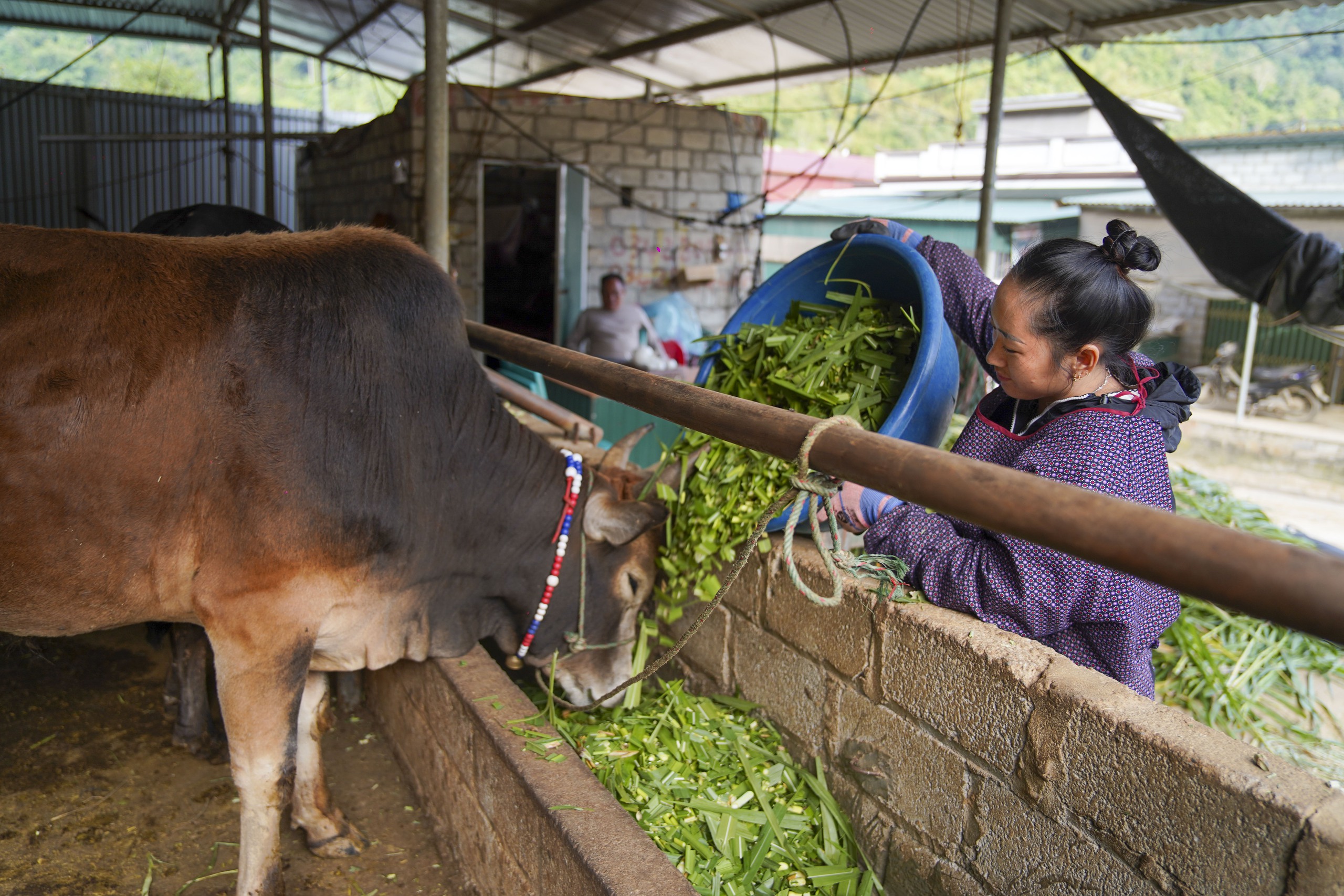 Thành viên Nhóm tự quản giúp nhau phát triển kinh tế ở xã Nghiên Loan chăm sóc đàn bò chăn nuôi liên kết, góp phần giảm nghèo bền vững.