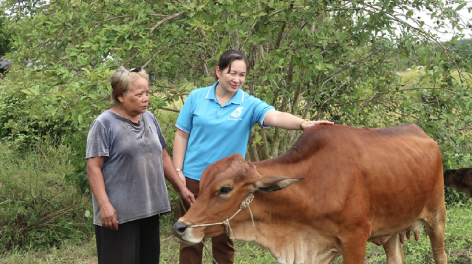 Chị Bế Thị Ngân, Chủ tịch Hội LHPN xã Ea Knốp (tỉnh Đắk Lắk) đến thăm hỏi hộ được hỗ trợ vốn nuôi bò.