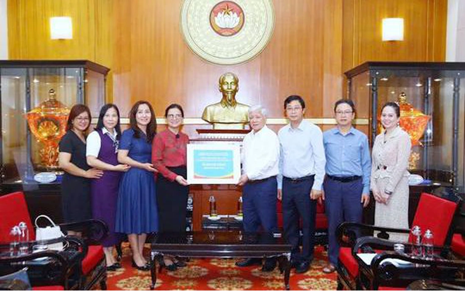 Ông Đỗ Văn Chiến (thứ 4 từ phải sang), Ủy viên Bộ Chính trị, Bí thư Trung ương Đảng, Chủ tịch Ủy ban Trung ương MTTQ Việt Nam, tiếp nhận ủng hộ từ Trường Tiểu học Thanh Xuân Trung, phường Thanh Xuân, Hà Nội