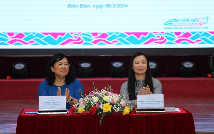 VWU Vice - President Nguyen Thi Thu Hien and Vice Chairwoman of Dien Bien Provincial People's Council Giang Thi Hoa chair the seminar.