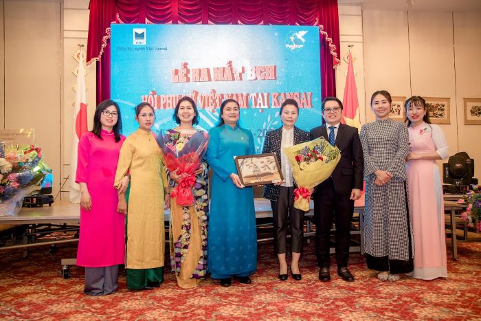 VWU First Vice President Do Thi Thu Thao (in blue) congratulated the Executive Committee of the Vietnam Women's Association in Kansai, Japan