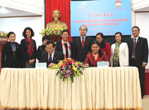 Sáng 31/12/2014, tại Hà Nội, đã diễn ra Lễ ký kết chương trình phối hợp giữa Ban Thường trực Ủy ban TW Mặt trận Tổ quốc Việt Nam (UB TW MTTQ) và Đoàn Chủ tịch TW Hội LHPN Việt Nam về góp phần tăng tỷ lệ nữ đại biểu Quốc hội khóa XIV và nữ đại biểu Hội đồng nhân dân (HĐND) các cấp nhiệm kỳ 2016- 2021. -