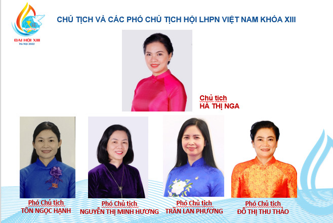 Đại hội đại biểu Phụ nữ toàn quốc lần thứ XIII, nhiệm kỳ 2022 - 2027, đã bầu ra Chủ tịch và 4 Phó Chủ tịch Hội LHPN Việt Nam khóa XIII. Cổng TTĐT Hội LHPN Việt Nam xin trích đăng tiểu sử của Chủ tịch và các Phó Chủ tịch Hội LHPN Việt Nam khóa XIII. -