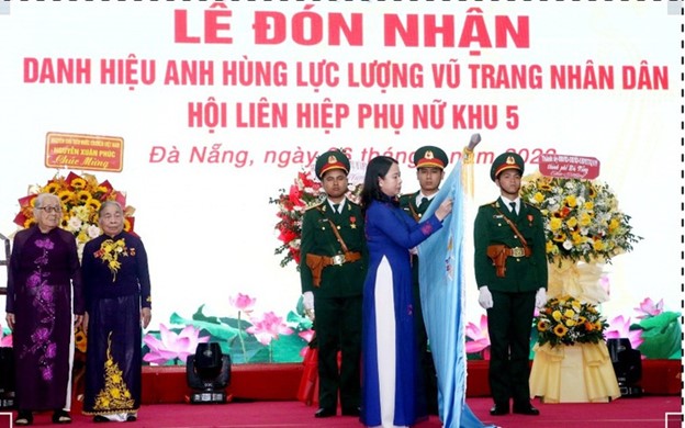 Ngày 6/3, Trung ương Hội LHPN Việt Nam phối hợp với Thành ủy Đà Nẵng, Bộ Tư Lệnh Quân khu 5 tổ chức Lễ đón nhận danh hiệu Anh hùng Lực lượng vũ trang nhân dân cho Hội LHPN Khu 5. -