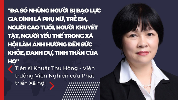 "Đa số những người bị bạo lực gia đình là phụ nữ và trẻ em, người cao tuổi, người khuyết tật, người yếu thế trong xã hội. Những tác động, ảnh hưởng của bạo lực gia đình đối với mỗi người có thể khác nhau như công việc, sức khỏe, danh dự, tinh thần...", Tiến sĩ Khuất Thu Hồng nhận định. -