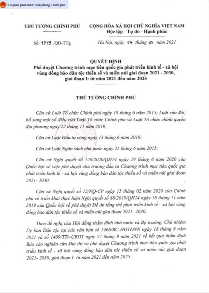 Quyết định số 1719/QĐ-TTg Phê duyệt Chương trình MTQG phát triển kinh tế - xã hội vùng đồng bào dân tộc thiểu số và miền núi giai đoạn 2021 - 2030