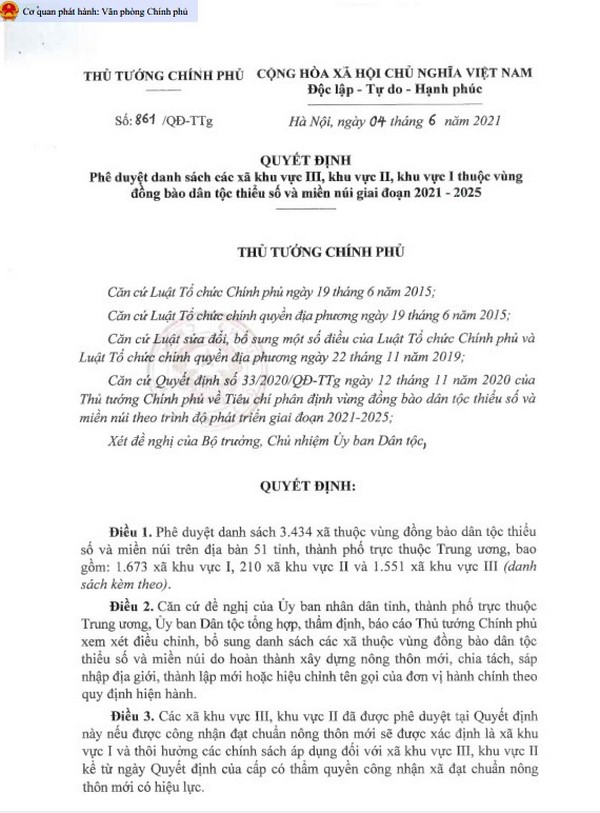 Quyết định 861/QĐ-TTg Phê duyệt danh sách các xã khu vực III, khu vực II, khu vực I thuộc vùng đồng bào dân tộc thiểu số và miền núi giai đoạn 2021-2025