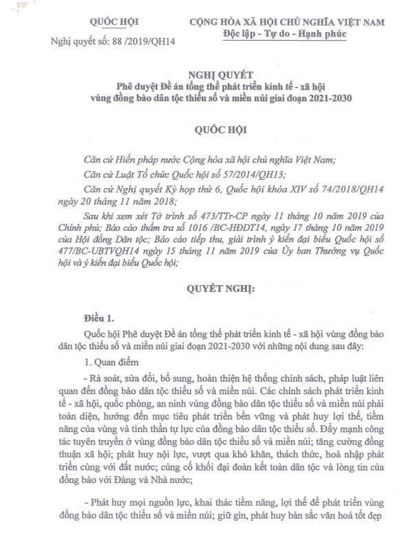 Nghị quyết 88/2019/QH14 Phê duyệt Đề án tổng thể phát triển kinh tế - xã hội vùng đồng bào dân tộc thiểu số và miền núi giai đoạn 2021 - 2030