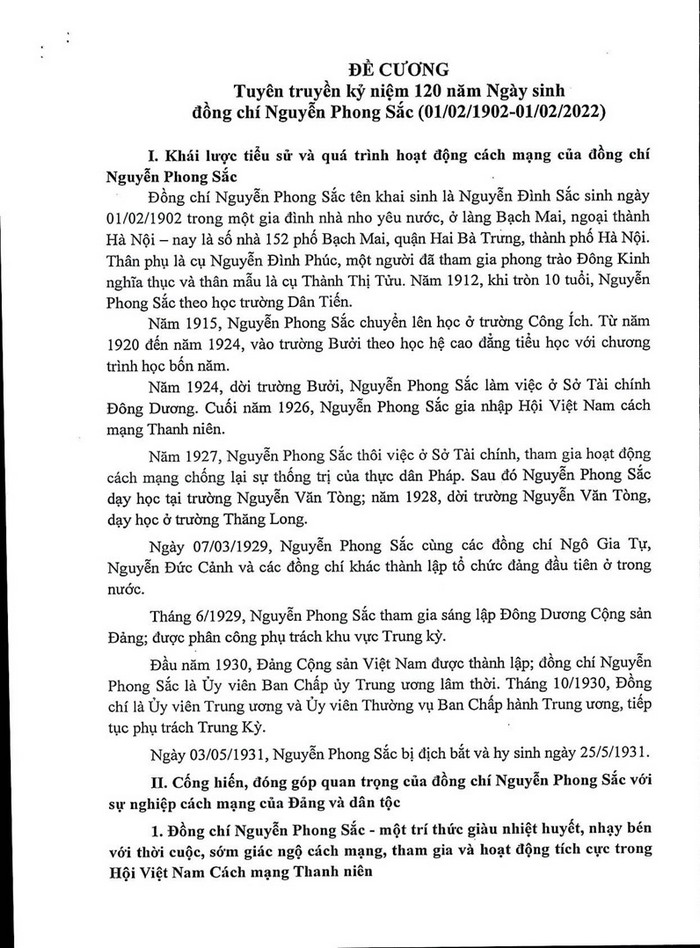 Đề cương Tuyên truyền kỷ niệm 120 năm Ngày sinh đồng chí Nguyễn Phong Sắc (01/02/1902 - 01/02/2022)