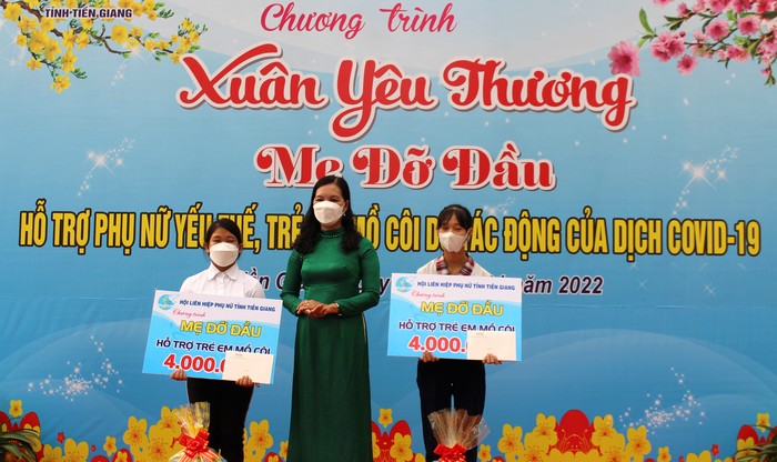 Sáng 19/1/2022, Hội LHPN tỉnh Tiền Giang tổ chức Chương trình “Xuân yêu thương, Mẹ đỡ đầu - Hỗ trợ phụ nữ yếu thế, trẻ em mồ côi do tác động của dịch Covid-19”. -