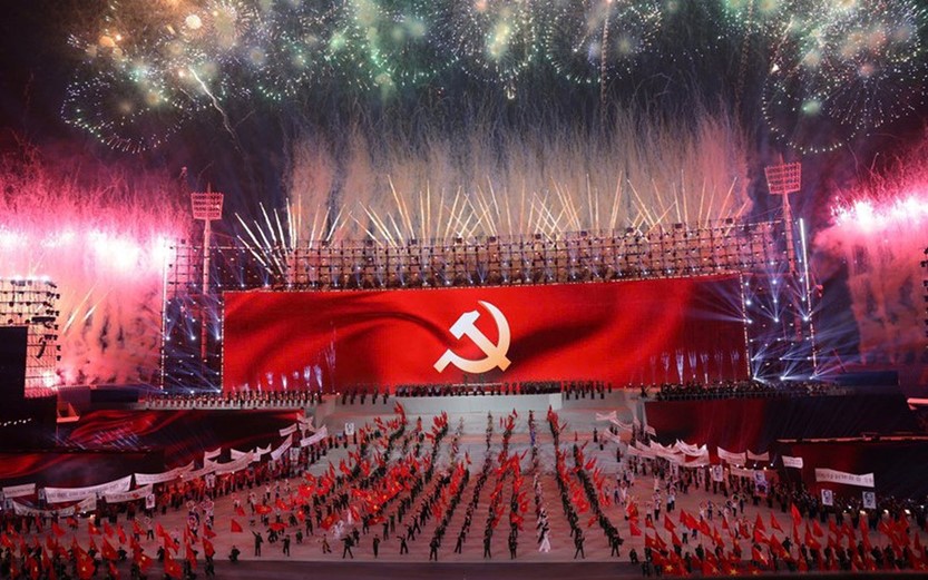 Chương trình “Dưới lá cờ vẻ vang của Đảng” là điểm nhấn đặc biệt, giàu ý nghĩa chính trị-văn hóa-nghệ thuật, thể hiện niềm tin son sắt của toàn Đảng, toàn dân, toàn quân đối với sự lãnh đạo của Đảng Cộng sản Việt Nam, quyết tâm đoàn kết một lòng thực hiện thắng lợi Nghị quyết Đại hội XIV. (Ảnh: TTXVN)
