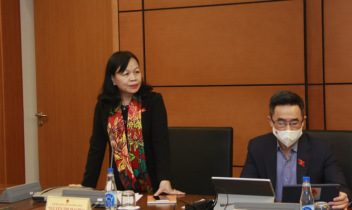 Đại biểu Nguyễn Thị Mai Hoa, Phó Chủ nhiệm Ủy ban Văn hóa, Giáo dục của Quốc hội, đoàn ĐBQH tỉnh Đồng Tháp, phát biểu tại tổ. Ảnh HH