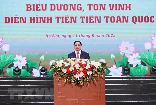 Thủ tướng Phạm Minh Chính phát biểu tại Hội nghị biểu dương, tôn vinh điển hình tiên tiến toàn quốc. (Ảnh: Dương Giang/TTXVN)