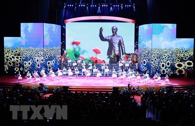 Chương trình nghệ thuật chào mừng Hội nghị biểu dương, tôn vinh điển hình tiên tiến toàn quốc. (Ảnh: Dương Giang/TTXVN)
