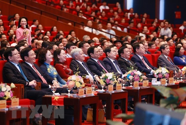 Lãnh đạo Đảng, Nhà nước và các đại biểu dự Hội nghị biểu dương, tôn vinh điển hình tiên tiến toàn quốc. (Ảnh: Dương Giang/TTXVN)