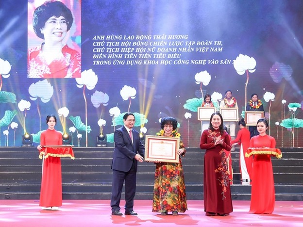 Thủ tướng Phạm Minh Chính và Phó Chủ tịch nước Võ Thị Ánh Xuân trao Bằng khen cho bà Thái Hương - Chủ tịch Hội đồng chiến lược Tập đoàn TH, Chủ tịch Hiệp hội nữ doanh nhân Việt Nam