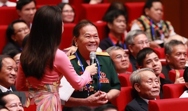 | Bằng hình thức sân khấu hóa, cùng với đánh giá kết quả thực hiện các phong trào thi đua yêu nước và biểu dương, tôn vinh điển hình tiên tiến gắn với tư tưởng Hồ Chí Minh về thi đua ái quốc qua các thời kỳ, tại Hội nghị các đại biểu được giới thiệu, giao lưu với nhiều điển hình tiên tiến tiêu biểu. Trong đó có như Giáo sư-Tiến sỹ, Nhà giáo Nhân dân Võ Tòng Xuân, người tâm huyết và có nhiều đóng góp quan trọng cho nông nghiệp Việt Nam, nhất là ở Đồng bằng sông Cửu Long; Già làng K’Tiếu ở xã Đinh Lạc, huyện Di Linh, tỉnh Lâm Đồng, người đã vận động người dân hiến đất, hiến công xây dựng đường giao thông và truyền dạy cho nhiều thế hệ trẻ, giữ gìn văn hóa cồng chiêng; bà Trần Thị Kim Thia (bà Sáu Thia) ngụ xã Hưng Thạnh, huyện Tháp Mười, tỉnh Đồng Tháp đã 20 năm cần mẫn dạy bơi miễn phí cho trẻ nhỏ ở trong và ngoài xã. Đó là Trung tá Nguyễn Chí Thành, Phó đội trưởng, Phòng Cảnh sát phòng cháy chữa cháy và cứu nạn cứu hộ, Công an Thành phố Hồ Chí Minh nhiều lần không quản hiểm nguy, cứu nhiều người khỏi lưỡi hái tử thần; Anh hùng Lao động, Nhà giáo Nhân dân Nguyễn Đức Thìn ở thành phố Từ Sơn, tỉnh Bắc Ninh có nhiều cống hiến cho sự nghiệp giáo dục của nước nhà, trong đó nổi bật là phong trào “Nghìn việc tốt”; Anh hùng Lực lượng Vũ trang Nhân dân, Trung tá Ngô Thị Tuyển ở thành phố Thanh Hóa; Huấn luyện viên trưởng Đội tuyển bóng đá nữ Quốc gia Việt Nam Mai Đức Chung; Vận động viên điền kinh Nguyễn Thị Oanh, người vừa giành 4 huy chương Vàng tại SEA Games 32... Các điển hình tiên tiến tiêu biểu đã chia sẻ nhiều câu chuyện về tinh thần nghị lực, đức hy sinh, tận tâm, vì nước, vì dân; đồng thời nguyện tiếp tục gương mẫu trong cuộc sống, lao động, học tập, công tác, góp phần xây dựng đất nước Việt Nam tươi đẹp hùng cường, thịnh vượng; người dân ấm no, hạnh phúc. |