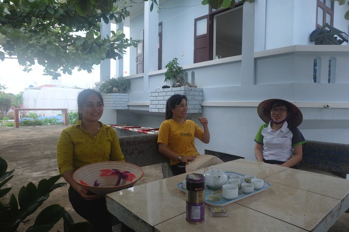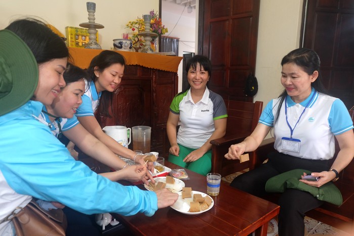 Cả đoàn vui vẻ cùng nhau thưởng thức món bánh, cảm giác vị ngọt thanh mát tan trong miệng, cái mệt, cái say, cái nóng dường như lùi xa, nhường chỗ cho cuộc hàn huyên tâm sự không ngớt về cuộc sống, về tâm tình của chị em và hoạt động công tác Hội nơi hòn đảo bé nhỏ, xa xôi mà vô cùng thiêng liêng của Tổ quốc này.