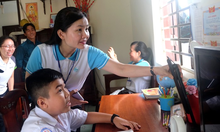 Phó Chủ tịch Hội Tôn Ngọc Hạnh khen ngợi thành tích học tập của cháu Thiên Long, con hội viên phụ nữ đảo Song Tử Tây