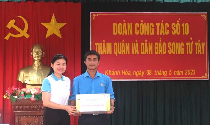 | Chiều 8/5, trong chuyến hải trình thăm huyện đảo Trường Sa và Nhà giàn DK1, đoàn công tác số 10 năm 2023 đã tới thăm, làm việc, tặng quà cán bộ, chiến sĩ, chính quyền và nhân dân đang công tác, sinh sống tại đảo Song Tử Tây. Đồng chí Tôn Ngọc Hạnh tặng quà UBND xã Song Tử Tây Tại đây, đoàn công tác Hội LHPN Việt Nam đã trao những phần quà thiết thực nhằm động viên, chia sẻ, gửi gắm tình cảm hậu phương ấm áp của hàng triệu trái tim phụ nữ nơi đất liền đến với đảo xa – một phần máu thịt thiêng liêng, không thể tách rời của Tổ quốc Việt Nam yêu dấu. |