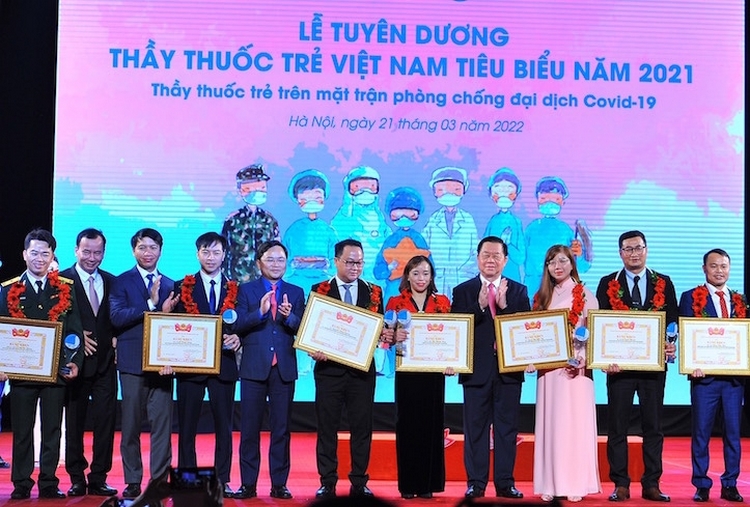 Bác sĩ Lò Thị Thanh Hợp trong trang phục dân tộc nhận Bằng khen và biểu trưng là một trong 10 thầy thuốc trẻ tiêu biểu toàn quốc trên mặt trận phòng chống COVID-19