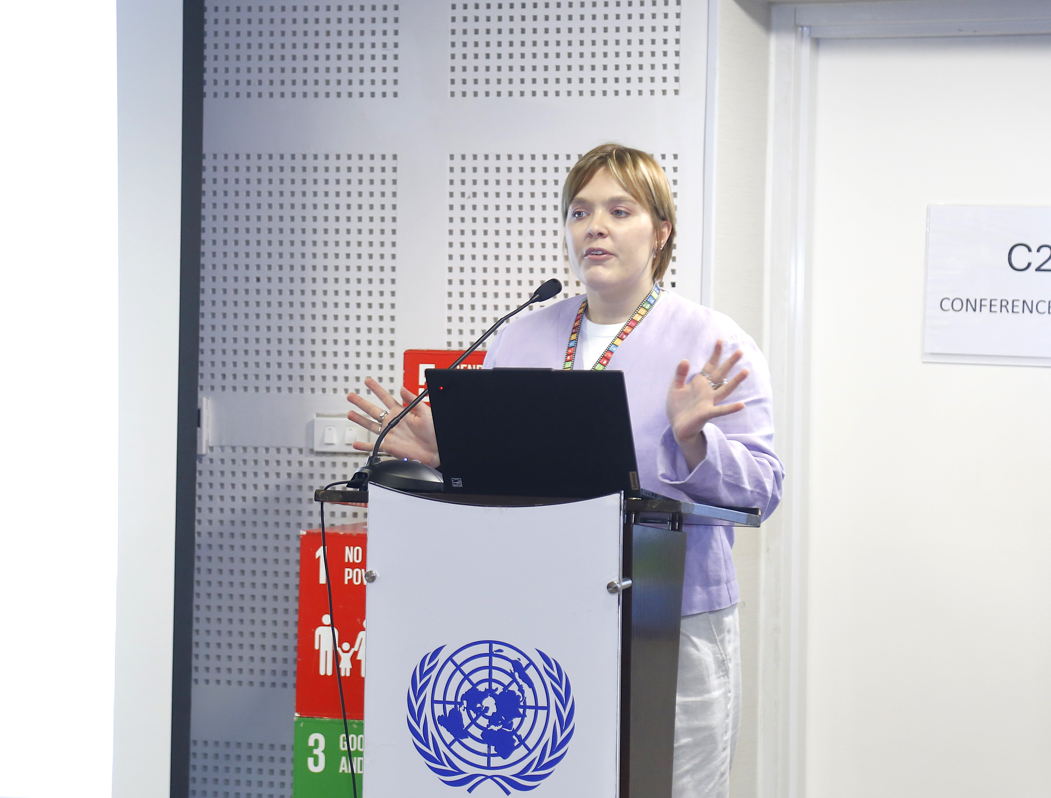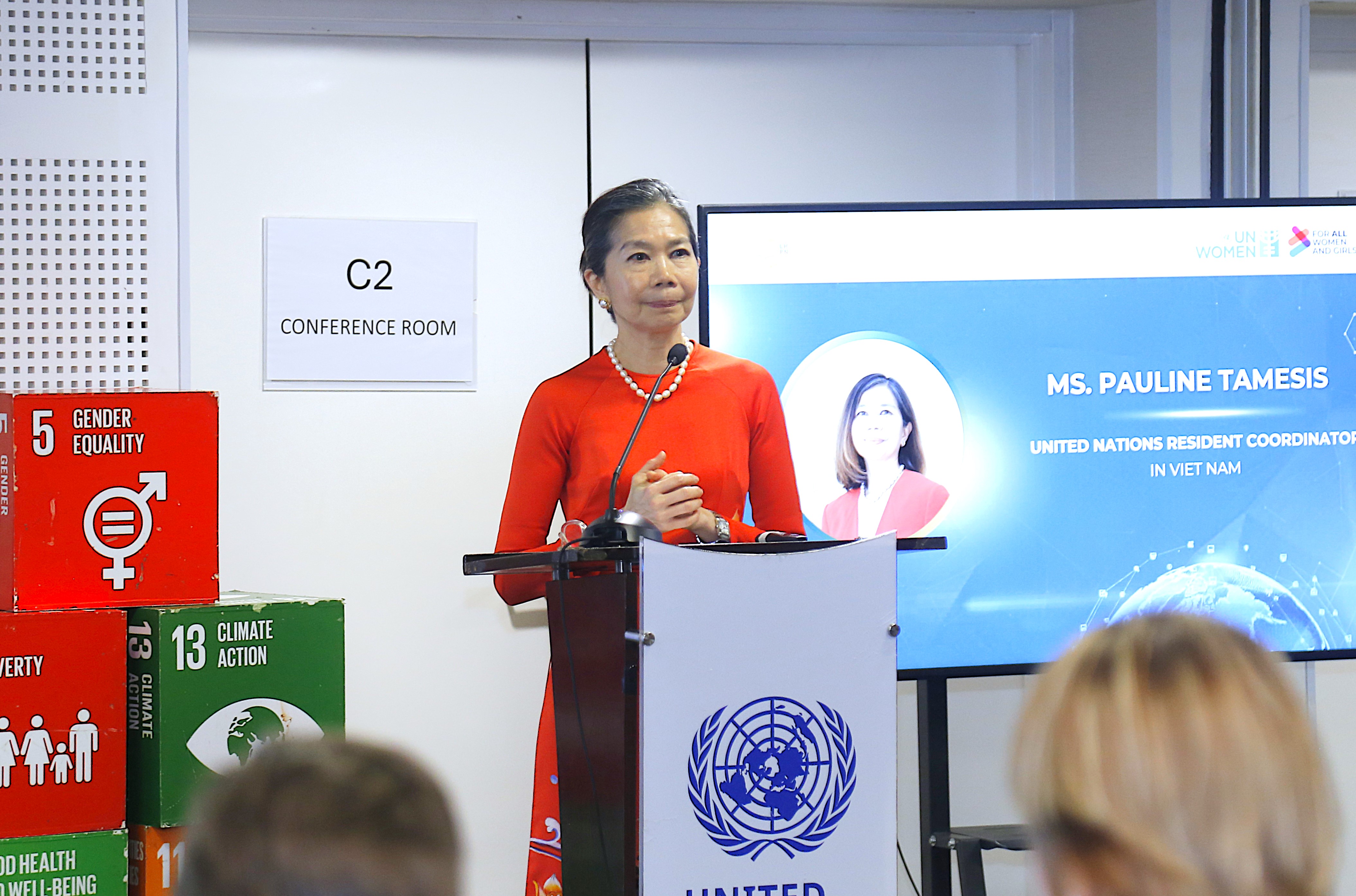 Phát biểu khai mạc chương trình, bà Pauline Tamesis, Điều phối viên thường trú Liên hợp quốc tại Việt Nam bày tỏ vinh dự khi được đón tiếp đoàn tới thăm và làm việc tại Toà nhà Xanh Liên hợp quốc; đồng thời giới thiệu tổng quan về các cơ chế quốc tế về bình đẳng giới, làm rõ sứ mệnh và chia sẻ các hoạt động trọng tâm của LHQ tại Việt Nam.