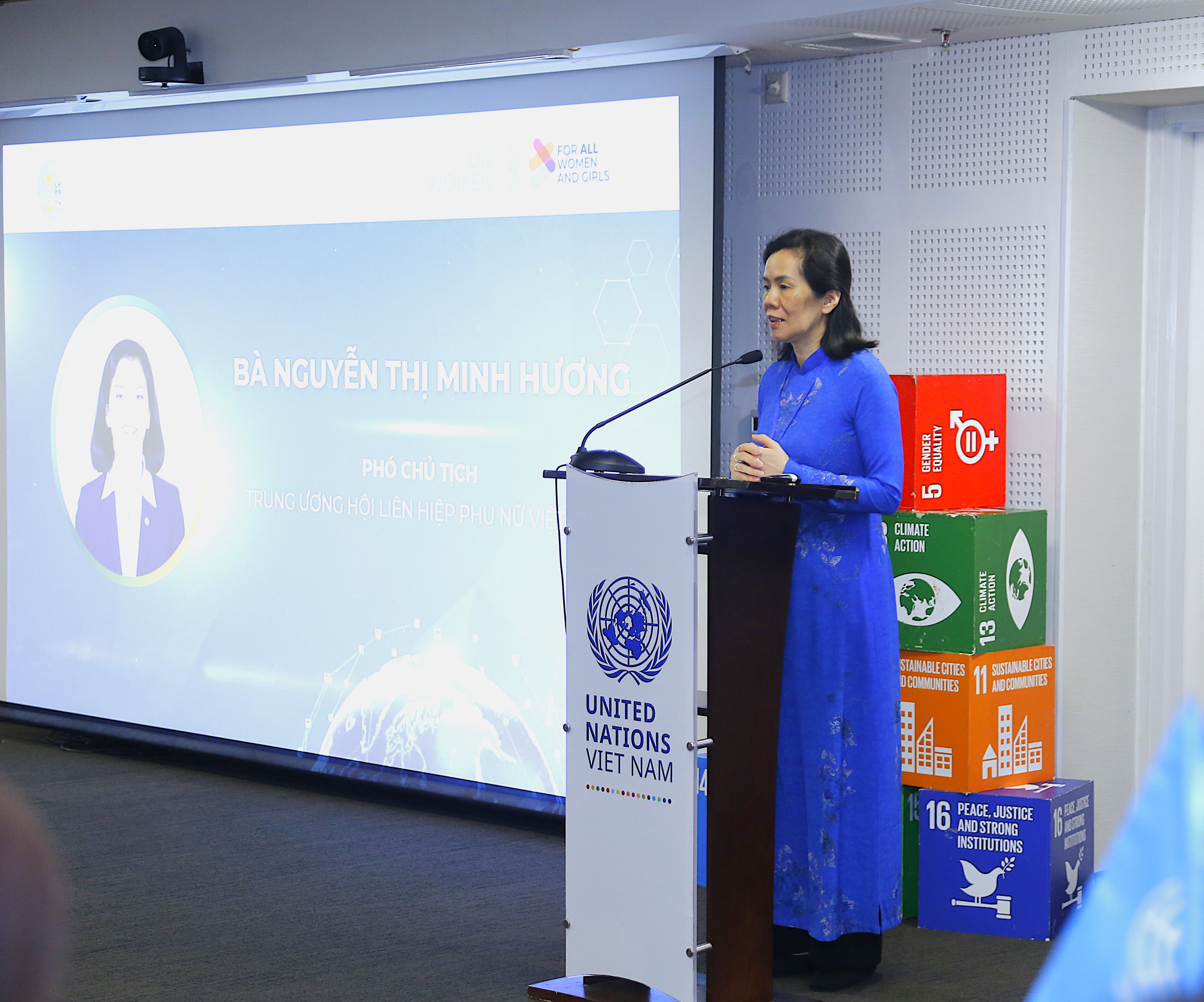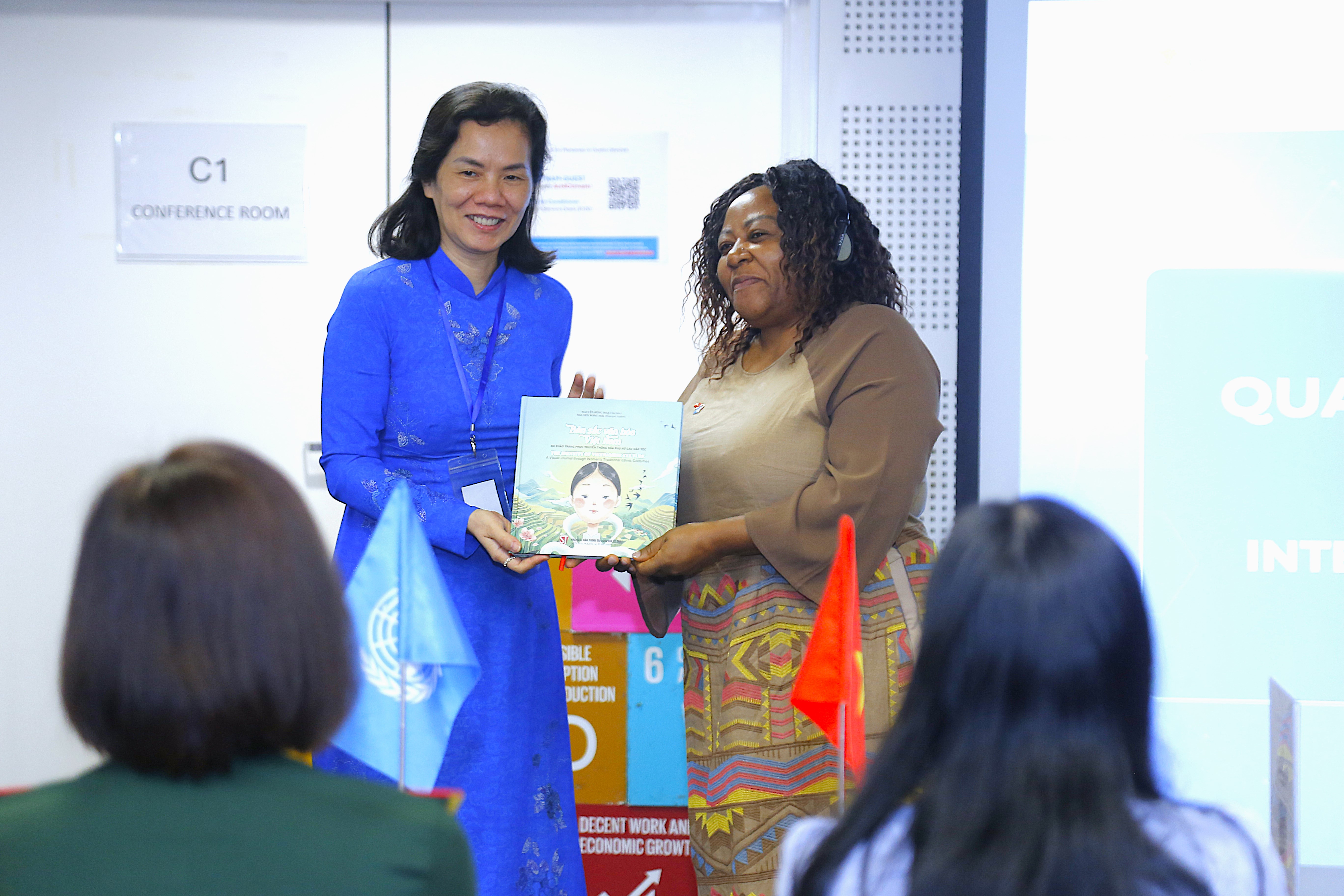 Bà Pauline Tamesis, Điều phối viên thường trú Liên hợp quốc tại Việt Nam (Áo dài đỏ) và bà Nguyễn Thị Minh Hương, Phó Chủ tịch Hội LHPN Việt Nam (Áo dài xanh) tại chương trình