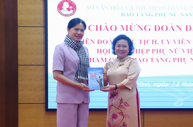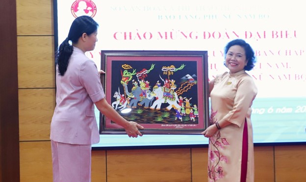 Sau khi nhận bức tranh Hai Bà Trưng, bà Nguyễn Thị Thắm - Giám đốc Bảo tàng Phụ nữ Nam bộ - đã tặng cuốn sách "Lịch sử Phụ nữ Nam bộ kháng chiến" cùng chiếc khăn rằn mang đậm dấu ấn Nam bộ cho Hội LHPN Việt Nam.