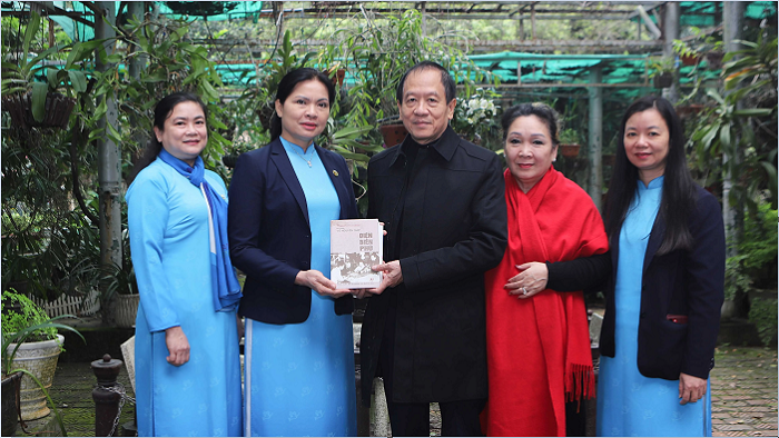 Thường trực Đoàn Chủ tịch TW Hội LHPN Việt Nam tiếp nhận tư liệu quý do người thân nhà Đại tướng Võ Nguyên Giáp trao tặng.