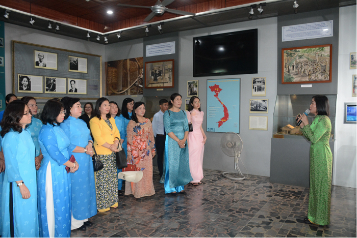 Đoàn đại biểu phụ nữ tham gia Chương trình “Phụ nữ cả nước hướng về Điện Biên” nghe thuyết trình về cuộc đời, sự nghiệp vĩ đại của Chủ tịch Hồ Chí Minh.
