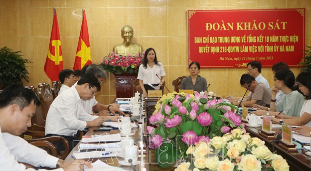 Đoàn khảo sát của BCĐ Trung ương tổng kết 10 năm thực hiện Quyết định 218 của Bộ Chính trị làm việc với Tỉnh ủy Hà Nam
