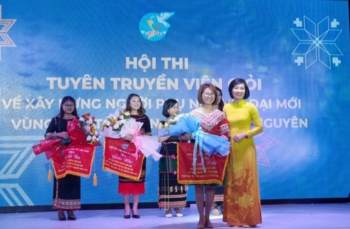 Bà Nguyễn Thị Kim Dung, Trưởng ban Tuyên giáo, TƯ Hội LHPNVN, trao thưởng cho đội đạt giải Nhất