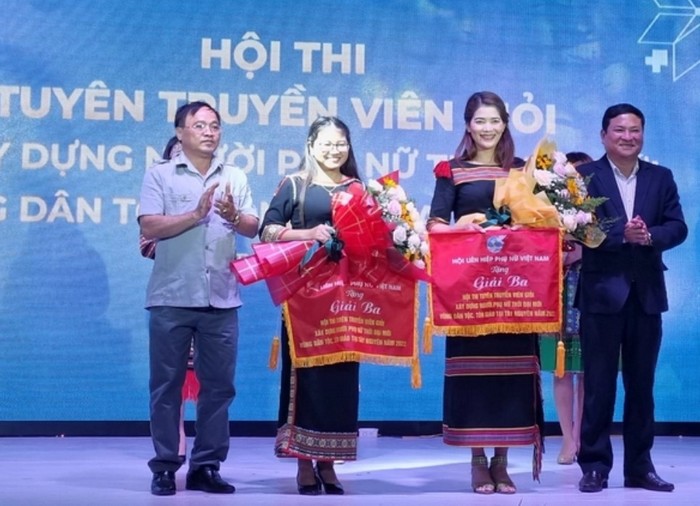 Phó Chủ tịch Hội LHPN Việt Nam Nguyễn Thị Minh Hương (giữa) trao giải Đặc biệt cho đội thi của tỉnh Đắk Nông Thực hiện nhiệm vụ Thông tin, tuyên truyền về dân tộc, tôn giáo của Đề án hỗ trợ thông tin, tuyên truyền về dân tộc, tôn giáo (gọi tắt là Đề án 219) của Chính phủ, ngày 23/8, TƯ Hội LHPN Việt Nam tổ chức Hội thi tuyên truyền viên giỏi về Xây dựng người phụ nữ thời đại mới vùng dân tộc, tôn giáo tại Tây Nguyên tại TP Kon Tum, tỉnh Kon Tum.
