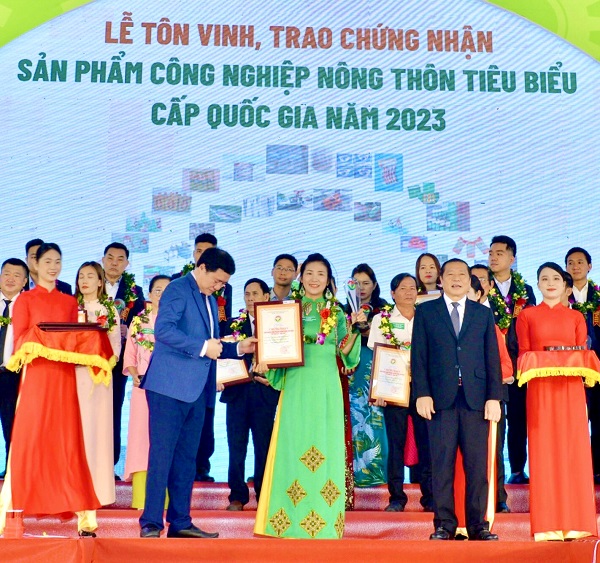 Giám đốc Nguyễn Thị Khuyên nhận danh hiệu sản phẩm công nghiệp nông thôn tiêu biểu cấp quốc gia năm 2023 cho sản phẩm "Ngói màu không nung Nasaki”;