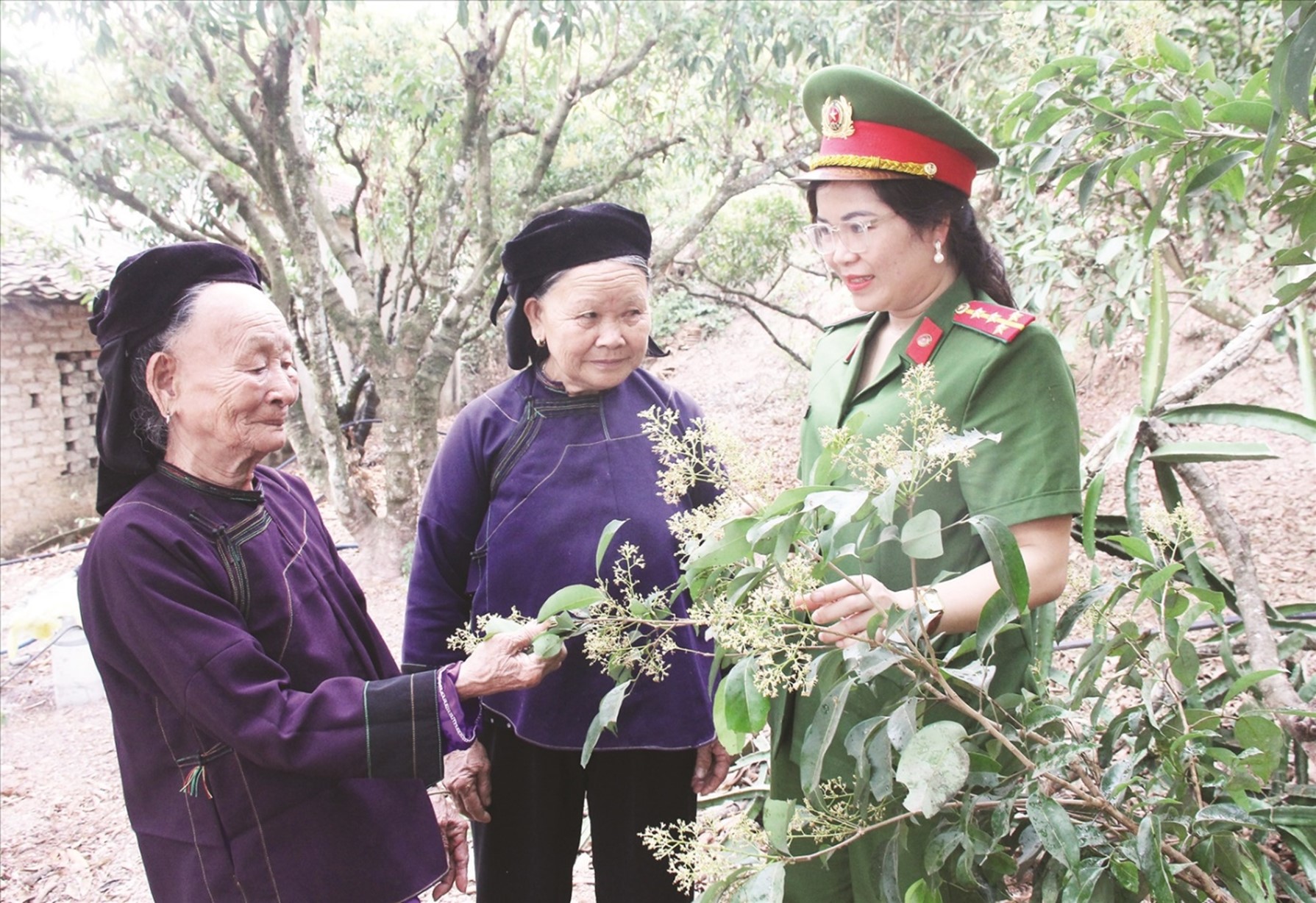 Đại úy Chu Thị Hồng Hà thăm hỏi, động viên tình hình sản xuất vải thiều của đồng bào dân tộc Nùng thôn Cái Cặn, xã Hộ Đáp Nữ Đại úy “Ba bám, bốn cùng”