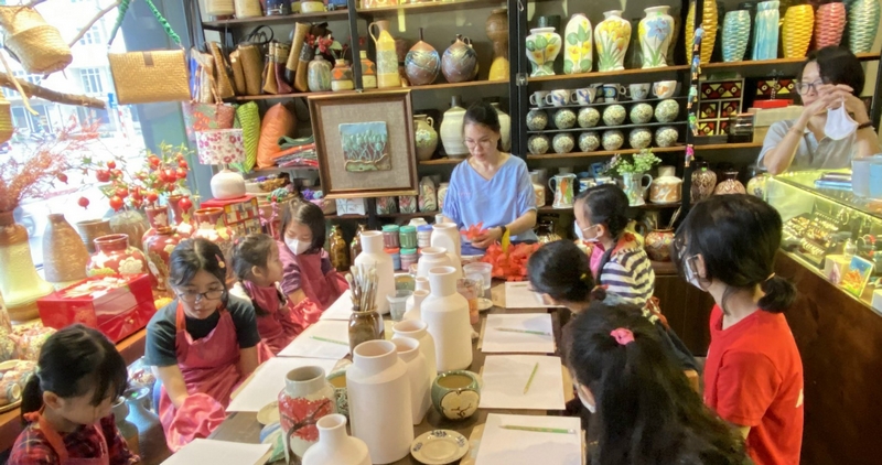 Đặc biệt là các buổi hướng dẫn vẽ lên gốm của tôi được cả các bạn nhỏ và phụ huynh đều rất yêu thích. Và kết quả là trong năm 2021, mặc dù dịch bệnh, giãn cách nhiều nhưng tôi cũng thực hiện được hơn 20 buổi workshop ươm mầm nghệ thuật với nhiều tác phẩm độc đáo, đẹp bất ngờ từ các bạn nhỏ. Dự án còn được tiếp tục thực hiện trong năm 2022. Ngoài việc hướng dẫn các bạn vẽ, tôi còn giới thiệu thêm cho các em về chất liệu và cách chế tác làm ra các sản phẩm mà các em vẽ lên, để cho các em hiểu rõ hơn, thêm yêu những sản phẩm thủ công truyền thống và trân trọng những sản phẩm mình làm ra.