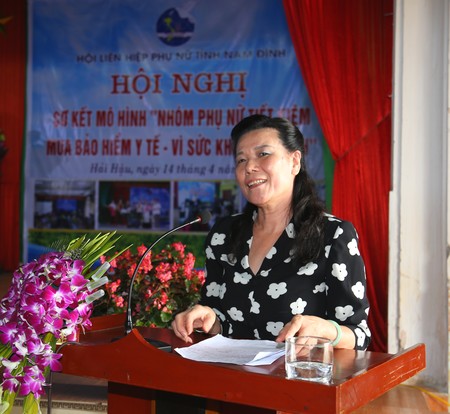 Phó Chủ tịch Hội LHPN Việt Nam Nguyễn Thị Tuyết khẳng định vai trò quan trọng của phụ nữ trong chăm lo sức khỏe cho các thành viên và quản lý chi tiêu tronggia đình. Đánh giá vấn đề vận động nhân dân mua BHYT hiện đang là vấn đề khó của các địa phương trên cả nước, Phó Chủ tịch biểu dương Hội LHPN tỉnh Nam Định đã chọn phần việc khó; đồng thời bày tỏ vui mừng trước những kết quả đạt được cũng như tính chắc chắn, bền vững của mô hình trong thời gian qua. Mô hình không chỉ góp phần hình thành thói quen tiết kiệm của chị em gắn với thực hiện Chỉ thị 05 về học tập, làm theo tấm gương đạo đức Hồ Chí Minh mà còn thể hiện sâu sắc tinh thần tương thân, tương ái, đạo lý nhân nghĩa của dân tộc. Thành công của mô hình tại Nam Định là cơ sở quan trọng để TW nghiên cứu, chỉ đạo nhân rộng ở các địa phương khác. Để mô hình phát triển bền vững, Phó Chủ tịch Hội Nguyễn Thị Tuyết đề nghị các cấp Hội LHPN Nam Định cần tích cực phối hợp với các ngành, đặc biệt là ngành bảo hiểm tổ chức tập huấn cho cán bộ Hội, cán bộ Nhóm tiết kiệm về kỹ năng tuyên truyền, vận động chị em tham gia mô hình cũng nhưbồi dưỡng năng lực quản lý, theo dõi tình hình mua thẻ và các đối tượng mua thẻ để kịp thời cập nhật, hỗ trợ các thành viên.