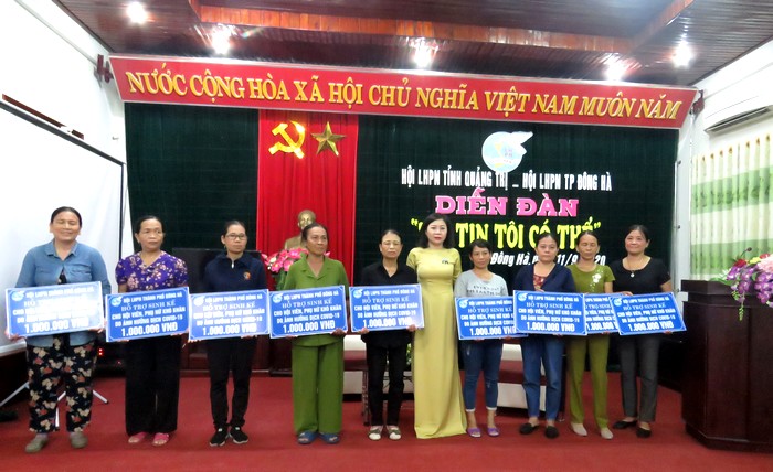 Tại diễn đàn, Hội LHPN thành phố Đông Hà và Hội LHPN TX Quảng Trị đã trao các suất quà hỗ trợ sinh kế cho các hội viên phụ nữ nghèo bị ảnh hưởng COVID-19 với tổng trị giá 10 triệu đồng.