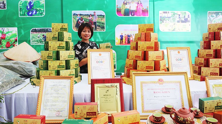 Chị Thuần trong gian hàng trà thảo dược tại Hội chợ OCOP Hà Nội.