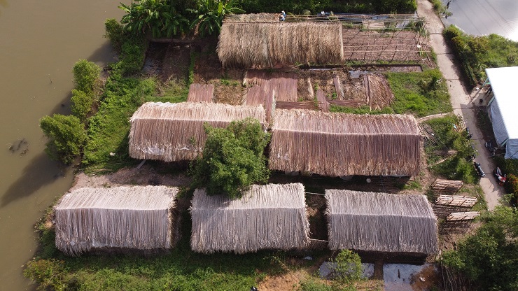 Vốn ít, nhà trại chị lợp bằng lá cây dừa nước, cột kèo cũng làm từ các cây có sẵn ở địa phương cho đỡ tốn chi phí. Những nhà trại làm tạm bằng các loại cây lá tại địa phương được chị Ril tận dụng nhằm tiết kiệm chi phí để trồng nấm.