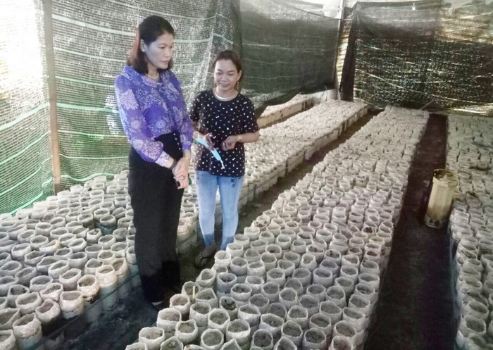 Phó chủ tịch Hội LHPN tỉnh An Giang Nguyễn Thị Quyến (áo xanh) thăm, hỏi một số thông tin về sản phẩm trồng nấm mối đen tại trang trại sản xuất nấm của chị Châu Thị Nương