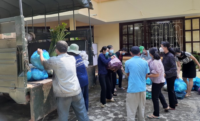 Cán bộ Hội LHPN tỉnh An Giang đang đưa quà lên xe chuẩn bị đi trao cho hội viên, phụ nữ tại các địa bàn bị ảnh hưởng bởi dịch bệnh, thiên tai