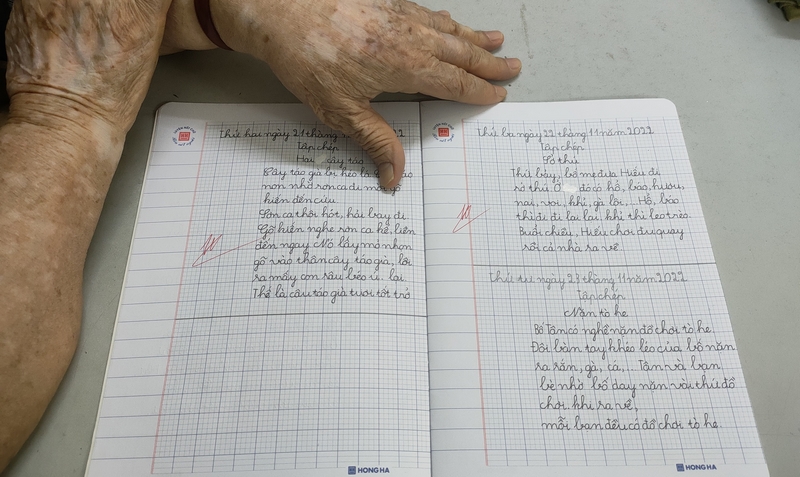 Niềm vui duy nhất của T. lúc này là mỗi ngày được đến lớp học tập cùng bà Côi và các anh chị em. Những nét chữ đang nắn nót theo từng ô ly cẩn thận, tỉ mỉ để cố gắng nhận những bông hoa điểm 10 của bà giáo.