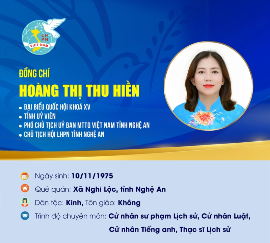 Bà Hoàng Thị Thu Hiền tiếp tục tái cử và giữ chức Chủ tịch Hội LHPN tỉnh Nghệ An; các đồng chí Nguyễn Thị Hà, Hoàng Thị Thanh Minh, Lê Thị Kim Chung giữ chức Phó Chủ tịch Hội LHPN tỉnh Nghệ An khóa XVII, nhiệm kỳ 2025 - 2030.