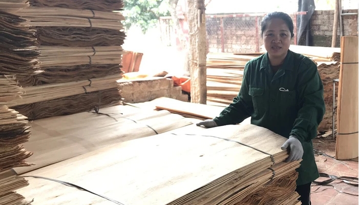 Chị Đỗ Thị Xuân tại xưởng của mình Gỗ bóc không phải là nghề mới trên địa bàn huyện Lạng Giang, tỉnh Bắc Giang, song đây là mô hình phát triển kinh tế hộ gia đình vừa cho thu nhập cao, vừa đảm bảo việc làm và thu nhập cho nhiều lao động địa phương.