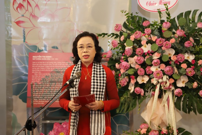 Các đại biểu chụp ảnh lưu niệm với bức tranh chân dung bà Nguyễn Thị Định làm từ lá sen Phát biểu tại chương trình, Phó Chủ tịch Hội LHPN Việt Nam Trần Lan Phương cho biết: “Sự kiện hôm nay có ý nghĩa hết sức đặc biệt khi Bảo tàng Phụ nữ Việt Nam được vinh dự “Tiếp nhận tranh chân dung Bà Nguyễn Thị Định làm từ lá sen”. Một ý tưởng độc đáo, vừa mang giá trị nghệ thuật lại giàu tính nhân văn sâu sắc”. Thay mặt lãnh đạo Hội LHPN Việt Nam, bà trân trọng gửi lời cảm ơn tới Câu lac bộ Phụ nữ với di sản văn hóa, Câu lạc bộ Di sản Áo dài Việt Nam đã phối hợp thực hiện, tạo nên một tác phẩm tuyệt vời để tri ân Nữ Anh hùng Nguyễn Thị Định. Bức tranh chân dung trao tặng được lưu giữ tại Bảo tàng sẽ tiếp tục lan tỏa, trở thành kho tư liệu giáo dục truyền thống quý báu, cao đẹp của người phụ nữ Việt Nam tới thế hệ trẻ trong tương lai. Bà Nguyễn Thị Định sẽ vẫn mãi như một bông hoa bất tử để muôn đời kính cẩn, noi gương và kế tục xứng đáng truyền thống tốt đẹp của các bà, các mẹ, các cô, các thế hệ phụ nữ đi trước.