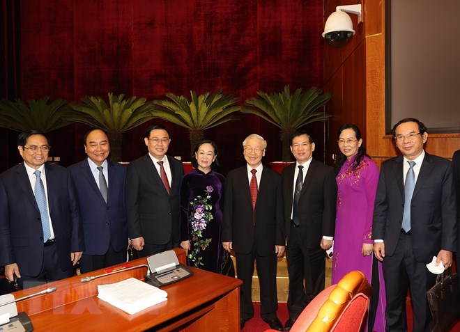 Tổng Bí thư Nguyễn Phú Trọng, Chủ tịch nước Nguyễn Xuân Phúc,Thủ tướng Chính phủ Phạm Minh Chính, Chủ tịch Quốc hội Vương Đình Huệ cùng các đồng chí lãnh đạo Đảng, Nhà nước dự bế mạc Hội nghị. (Ảnh: Trí Dũng/TTXVN)