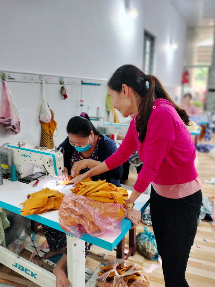 Chị Nguyễn Thị Mỹ Trọng (áo đỏ) đang hướng dẫn chị em may